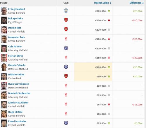 英超球员身价更新:哈兰德涨至2亿欧,萨卡降至1.3亿欧