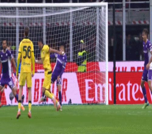 第62分钟,AC米兰左路压上,帕夫洛维奇带球推进后横传做球,莱奥接球往前调整,突然横向甩开防守超远距离大力轰射,皮球直入球门左下死角,这是莱奥打入的新赛季首球,AC米兰1:1快速扳平比分。第80分钟,AC米兰前场右侧转移左侧,又是连续的配合,里奇禁区前沿外脚背撩传,吉梅内斯点球点左侧接球转身扫射被挡出,吉梅内斯机敏跟过去再抢球时被帕里西拉倒。主裁在VAR确认后吹罚了点球,莱奥操刀主罚一蹴而就梅开二度,AC米兰2:1逆转绝杀佛罗伦萨。