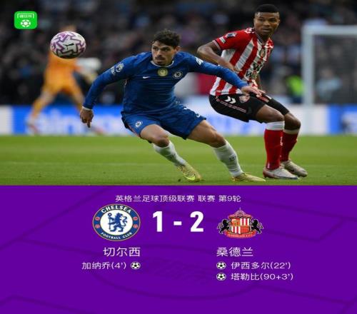 北京时间10月25日英格兰足球顶级联赛 联赛 第9轮,切尔西主场对阵桑德兰。上半场加纳乔斩获蓝军生涯首球,之后切尔西门前混乱,伊西多尔破门。下半场补时阶段塔勒比推射绝杀。最终切尔西1-2不敌桑德兰。