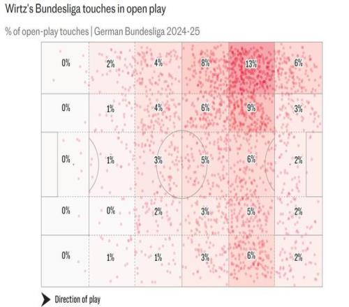 维尔茨被签下是作为利物浦的10号位球员,但上赛季他在勒沃库森的大部分触球发生在左翼(当时他主要司职3-4-2-1阵型中的左路攻击型中场)。上赛季在德甲,他45%的触球发生在左路进攻区域。而本赛季在利物浦,这一比例仅为25%。总体而言,他在利物浦在右路的触球比例(27%)实际上更高。