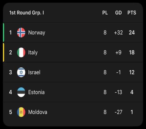 本届世预赛,挪威队同意大利、以色列、爱沙尼亚和摩尔多瓦同处I组。起初,外界都认为意大利队是直接晋级的最大热门。随着比赛的进行,哈兰德、厄德高两大英超球星领衔的挪威队,成为了I组最大的黑马。他们在世预赛中火力全开,8战全胜狂轰37球只丢5球,以绝对优势排名I组榜首。