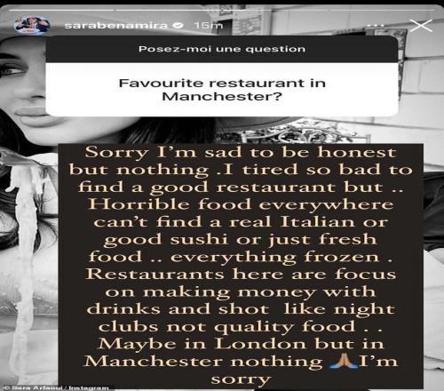 类似的情绪也曾出现于京多安的妻子萨拉-阿尔法乌伊身上。她在2022年10月批评曼彻斯特餐饮水平,称找不到“真正的意大利菜、好吃的寿司或新鲜食物,一切都是冷冻的”。她在社媒的限时动态中写道:“抱歉,我真的很难过。我真的很努力地想找一家好餐厅,但到处都是难吃的食物。找不到正宗的意大利餐厅,也找不到好吃的寿司,更找不到新鲜的食材……全是冷冻食品。这里的餐厅都像夜总会一样,只顾着卖酒水赚钱,根本不注重食物品质。也许伦敦有,但曼彻斯特什么都没有。抱歉。”